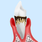 顎の骨の3分の2以上が溶けた状態。歯のグラつきがひどくなります。歯ぐきが下がり歯根が露出し歯が長く見えたり、歯と歯ぐきの境目から膿が出て口臭がよりきつくなったりします。この状態を放置すると、最悪の場合、歯が抜け落ちます。歯周ポケットの深さは、8mm程度と非常に深くなります。 |